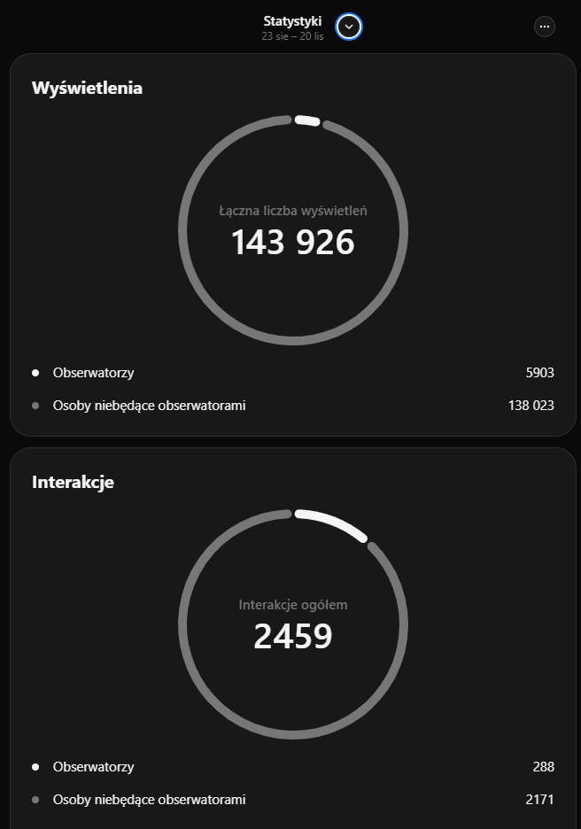 Threadsy (o nich napisałem osobny tekst, o tu!) to mój najlepszy przyjaciel teraz chyba. Bo TwitterX nie udostępnia statystyk i ogólnie pomimo sporej liczby Obserwujących tam, to bardzo sporadycznie jakiś temat pyknie. A szkoda, bo lubię tamtejszą szyderę. A Wątki? Jak tam idzie?