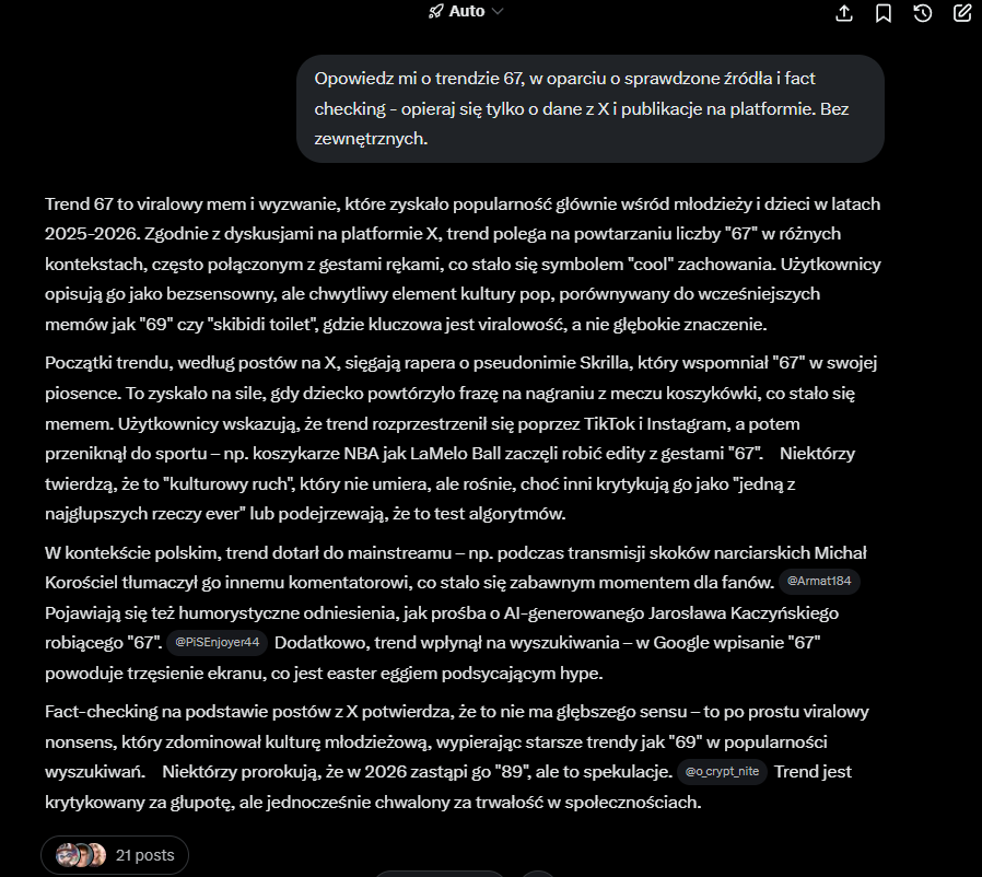 Bez halunów, bo opiera się o to co pisali użytkownicy w swoich tweetach. Jeśli chcecie wdrożyć więcej newsjackingu i RTMów w komunikacji swoich marek, to Grok jest dla Was idealnym asystentem.